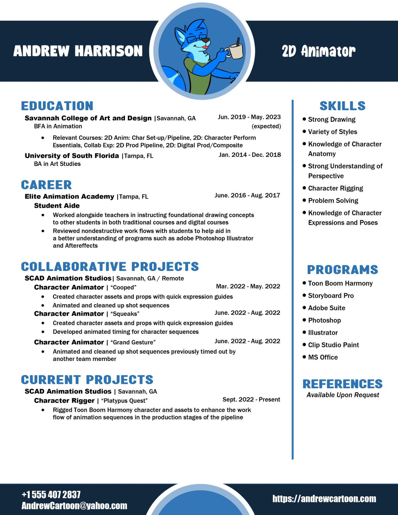 Currently studying 2D Animation at Savannah College of Arts and Design Located in Savannah, GA with an expected Graduation date of May 2023.I work as a freelance visual development artist in my down time from college productions. Mainly focused on full turnaround sheets, expressions of characters and 2D puppet rigging in Toon Boom Harmony. Working collaboratively on projects is always an opportunity I look forward to, I enjoy problem solving in order to help others in a production.